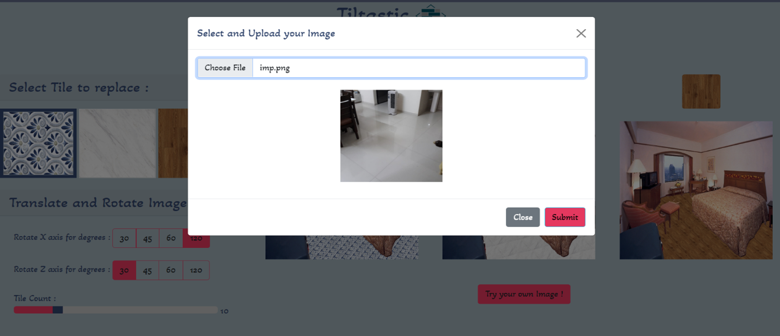 - Users upload a room image, choose from preset tile designs or custom textures and then adjust rotation along X and Z axes plus tile count for the final visualization.