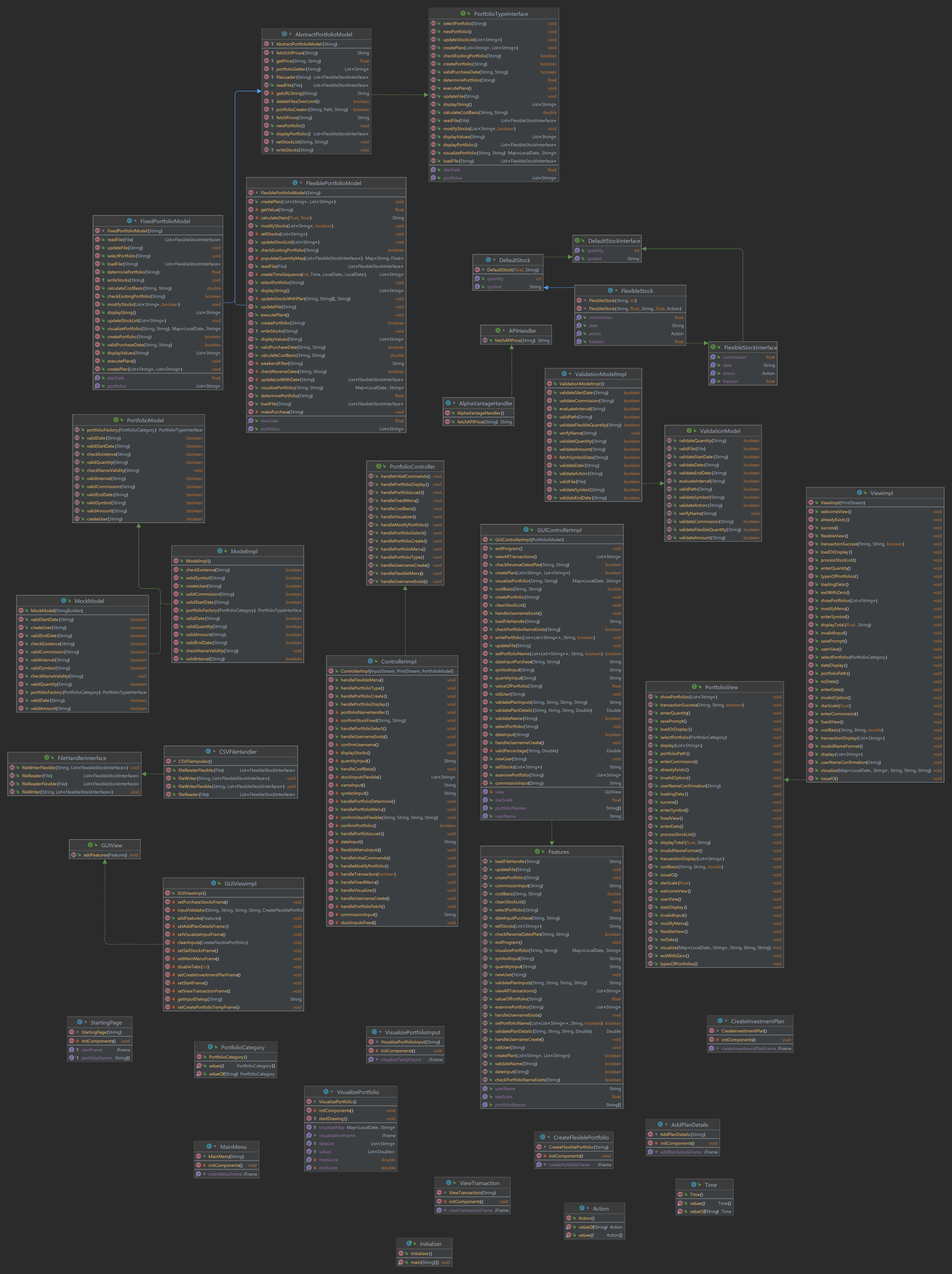 To keep the code extensible, I introduced factories for portfolio types, helper models for validation and caching, command pattern for user operations and modular interfaces for adding new features incrementally. Market data retrieval used the AlphaVantage API with caching and date validation.